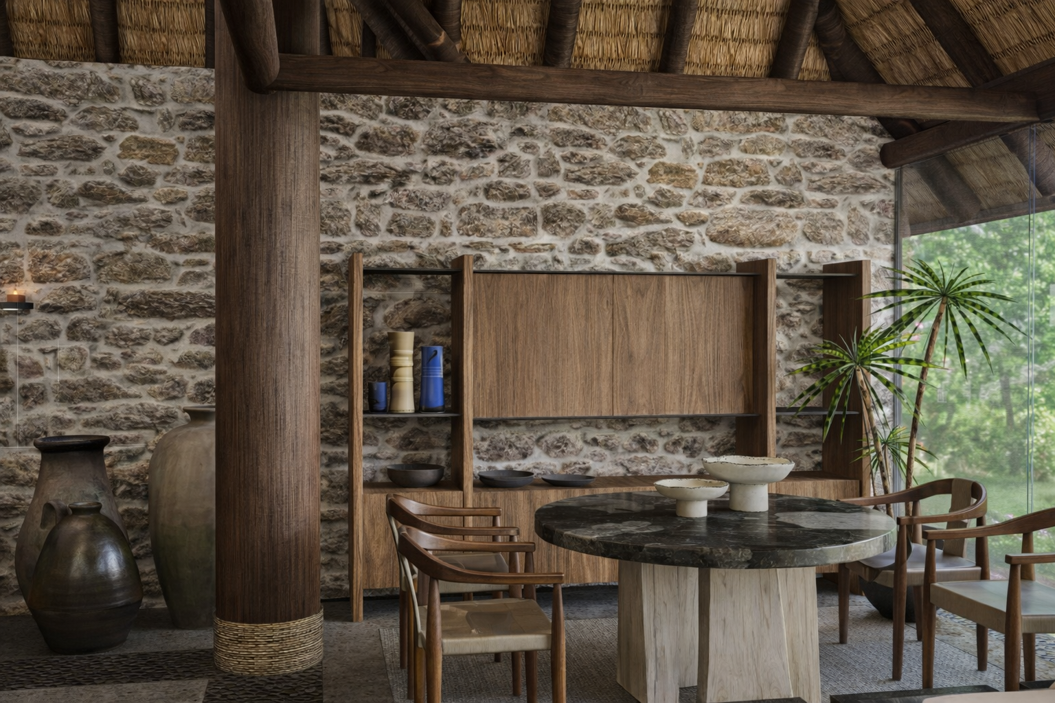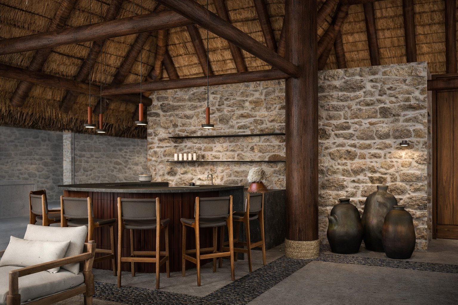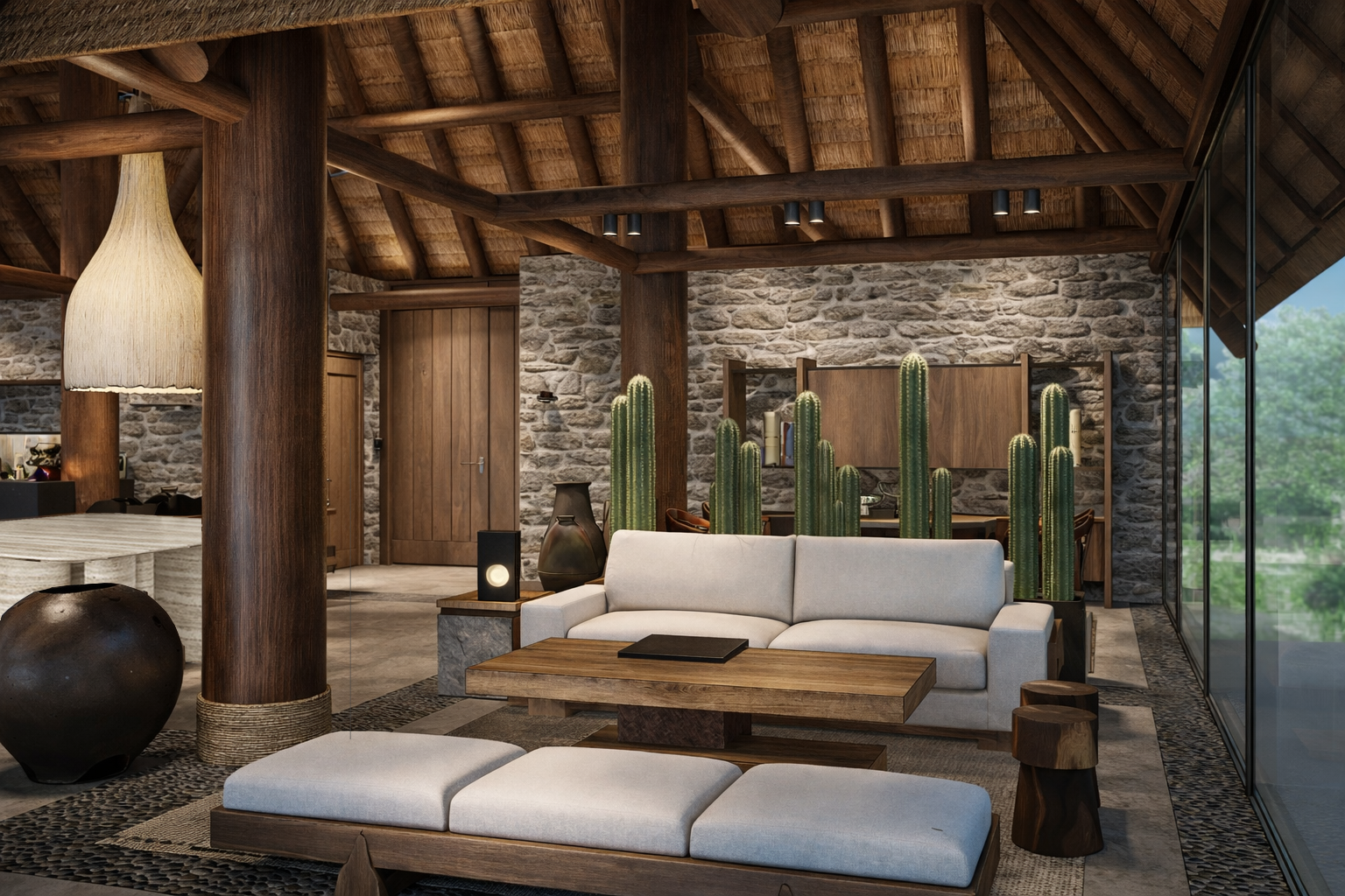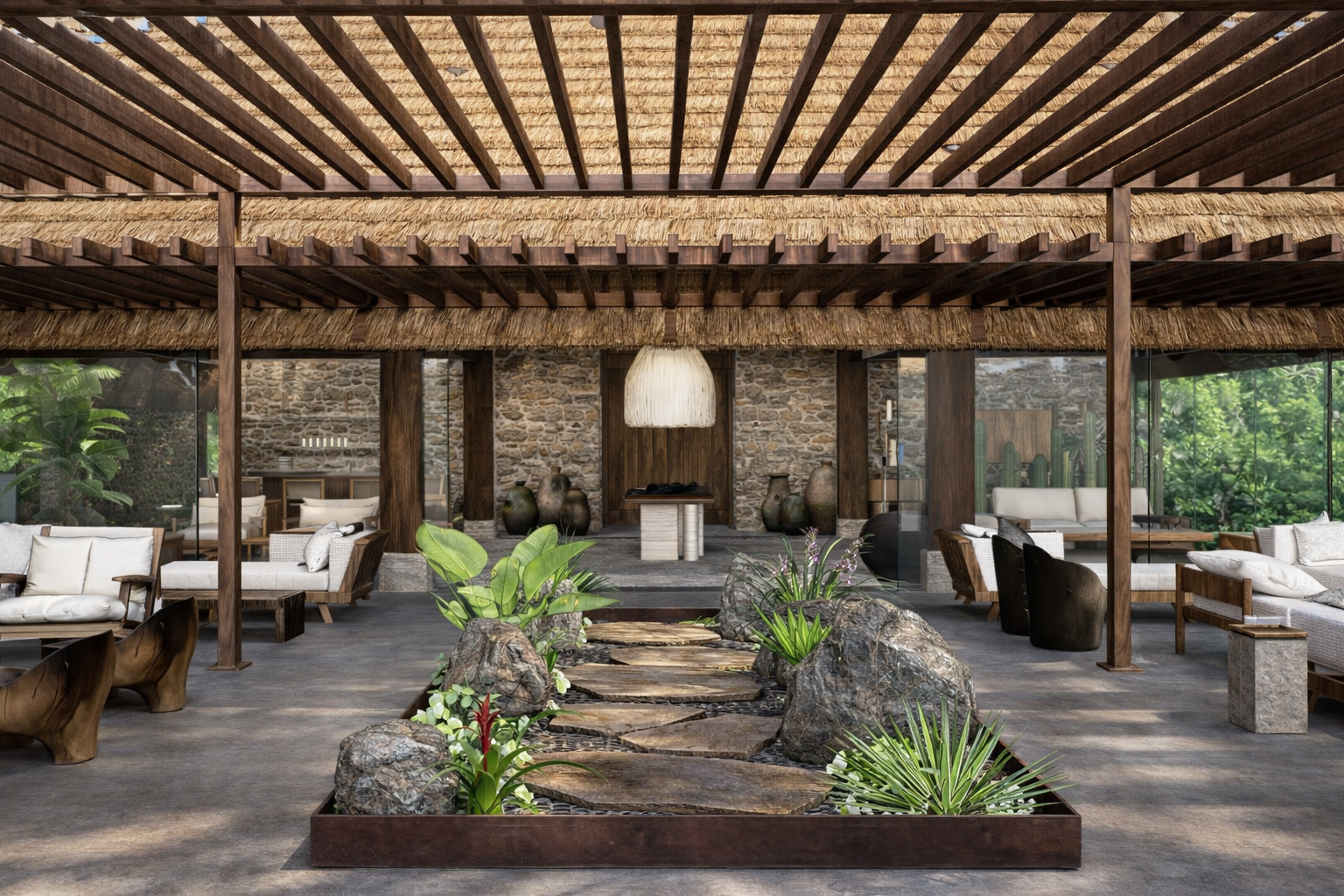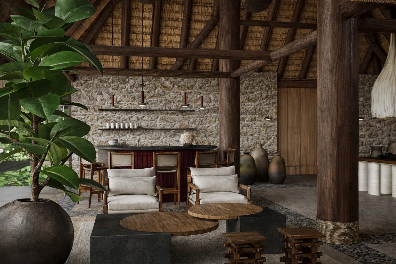[ABSTRACT] A renovation to the sales center at mountainside private development Punta Garrobo. The design proposes a new bar, lounge spaces, and outdoor patio covered by a natural wood trellis. The design includes only locally sourced Mexican materials and each furnishing and fixture product is made by Mexican designers, manufacturers, and sold by Mexican vendors.